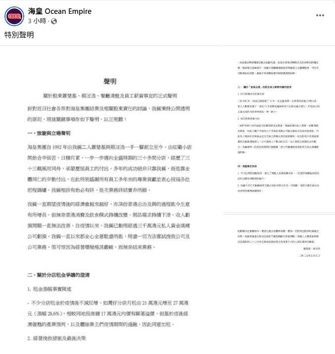 海皇粥店周三(7日)發聲明宣布全線結業,兩名創辦人兼董事蕭楚基和蔡汪浩今(9日)在「海皇」facebook專頁發聲明,表示自新冠疫情以來,粥品需求持續下滑,虧損無法改善,兩人已動用超過3000萬元私人資金「填補公司虧損」,「唯一的居住物業都已被賤賣」,無力再貸款填補虧損,無奈結束業務,今已啟動清盤程序,並主動聯絡勞工處並提供所需文件及一切細節。