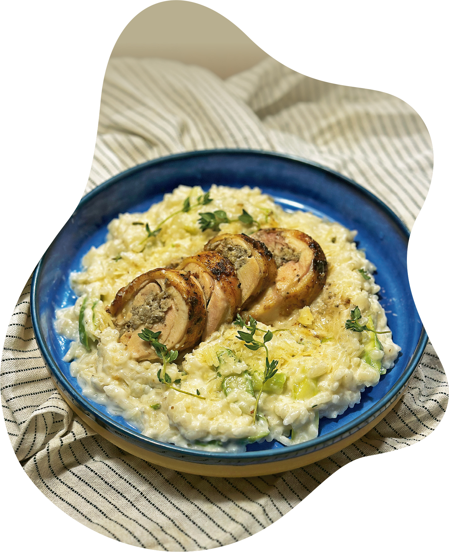 21.雞卷切片,鋪在意大利飯上,如喜歡芝士可以加點巴馬臣,最後澆上橄欖油即成