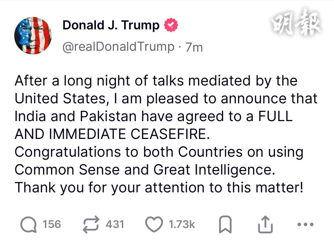 即時國際 特朗普:印巴同意即時停火 (20:06) 發佈於 5 個月 前 2025 年 5 月 10 日 By 明報 美國總統特朗普於本港時間周六晚上約8時在旗下社交平台Truth Social發文,宣布印度和巴基斯坦在美方斡旋下,已承諾即時全面停火。 巴基斯坦副總理兼外長達爾在社交平台X證實,印巴雙方已同意即時停火。 (Truth Social) 相關文章:印巴衝突編輯推介 Up Next 英國軍情六處新首長 將由女性出任 (15:36) 不要錯過 西斯汀聖堂煙囪白煙 新教宗選出 (00:09) 繼續閱讀 贊助商 猜你喜歡 沙特巴基斯坦簽防禦協議 美角色動搖 分析:以炸卡塔爾掀餘波 海灣國質疑華府安全擔保 全球核風險升溫 路透:印誤判華製導彈射程 折損戰機 兩國官員談5.7空戰內幕 霹靂-15遠距殺傷力大 「助斡旋巴印衝突」 巴基斯坦促頒特朗普和平獎 (18:23) 央媒披露霹靂-15E導彈全自動生產線 晤王毅談與印停火 巴基斯坦外長:感謝中方主持公道 (22:44)