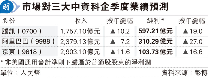 【明報專訊】本周重磅中資科技股集體放榜,周三公布業績的騰訊(0700)獲機構幾乎一致看好,指其網遊相關收入穩中有升。至於接力於周四公布業績的阿里巴巴(9988),里昂稱市場對人工智能(AI)產品需求增加、佣金率提升將推動該公司首季業績向好。京東(9618)方面,麥格理稱其於外賣市場燒錢搶客做法,令其自身短期盈利前景面臨下行風險,更狠削其目標價四成。