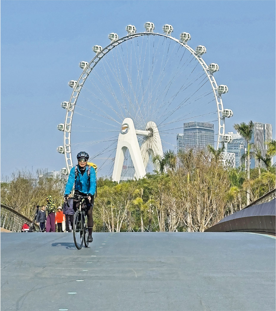 【明報專訊】風和日麗,騎單車走在深圳西部濱海50公里騎行道上,天水圍、流浮山、白泥、屯門菠蘿山,甚至是K11商場一一映入眼簾,讓人一時忘了自己身在深圳。這條單車徑去年底才全線貫通,從福田區到寶安國際機場附近的西灣紅樹林公園,途經前海多個人氣新景點,串連深圳海灣美景與城市風光,標榜「山海連城」。全程輕鬆騎行約需6小時,但人氣打卡位接力登場,新開幕的藝術商場、純白摩天輪、期間限定趴地巨鴨,單車難免愈踩愈慢……