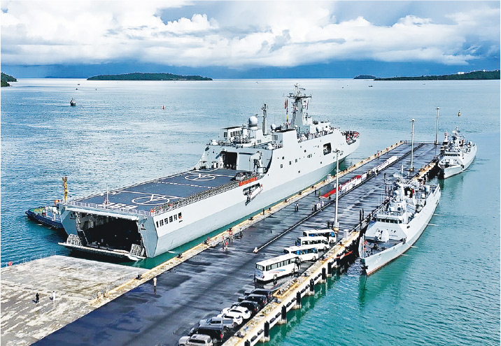 【明報專訊】中國解放軍「長白山」號綜合登陸艦前日在柬埔寨雲壤港靠泊,是中柬雲壤港聯合保障和訓練中心掛牌運行後,首次保障中柬聯合演習。