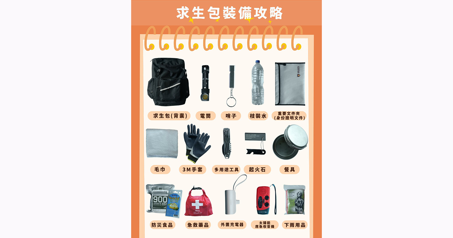 外遊自救隨身包應以輕便、多功能、不佔空間為原則,可常備手電筒、哨子、水、毛巾/防災紗布、小型急救包、充電寶等。出發前準備「緊急應變計劃」,與外遊伙伴計劃應變策略,設定離開路線、集合地點等。