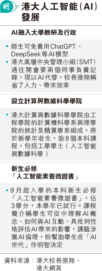 張翔又稱AI有助大學行政省卻人力、提升效率,過往港大高層會議需兩人在旁記錄內容,如今改用AI加快效率;師生亦可免費使用各類AI工具,「教育上尤其在AI的投資,非常必要」。