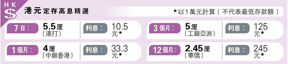 經濟 港元定存渣打7日年利率見5.5厘 發佈於 5 個月 前 2025 年 5 月 20 日 By 明報 【明報專訊】港元定存高息精選7日見5.5厘,為渣打客戶網上兌換指定外幣並開立外匯定期存款之優惠年利率。 (請看附圖) 相關文章: Up Next 港元1個月拆息跌穿1厘 3年低 高盛:樓市受惠低息 上調明後兩年樓價目標 不要錯過 陳茂波:資金流向利率存變數 繼續閱讀 贊助商 猜你喜歡