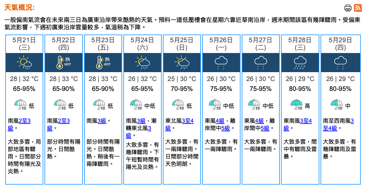 即時熱點 天氣|天文台:周三多雲有驟雨 日間有陽光炎熱市區最高32°C (20:54) 發佈於 9 個月 前 2025 年 5 月 20 日 By 明報 天文台表示,本港地區明日(21日)天氣預測大致多雲,局部地區有驟雨。明早最低氣溫約28°C,日間部分時間有陽光及炎熱,市區最高氣溫約32°C,新界再高一兩度。吹輕微至和緩偏南風。展望隨後一兩日部分時間有陽光,日間天氣酷熱。周末期間有幾陣驟雨,漸轉吹和緩東北風,下周初氣溫稍為下降。 相關文章:天文台天氣天氣速遞編輯推介 Up Next 「520」結婚熱潮 圖看內地新人註冊結婚【多圖】 (19:19) 不要錯過 天氣|天文台:局部地區有驟雨 最高氣溫32°C (08:26) 繼續閱讀 贊助商 猜你喜歡 天氣|天文台:周日早上市區最低14℃ 部分地區寒冷 (17:55) 天氣|天文台:多雲有幾陣雨 今晚轉涼降至約17℃ (09:25) 【Emily】天文台「矚目天氣及氣候事件選舉」 投票有機會獲紀念品 天氣|天文台:周六多雲有雨 晚上轉涼氣溫17至21°C 下周日跌至最低14°C (21:22) 天氣|天文台:短暫時間有陽光 最高19°C (08:24) 天氣|天文台:周四多雲早晚有微雨 氣溫介乎17至20°C (20:57)