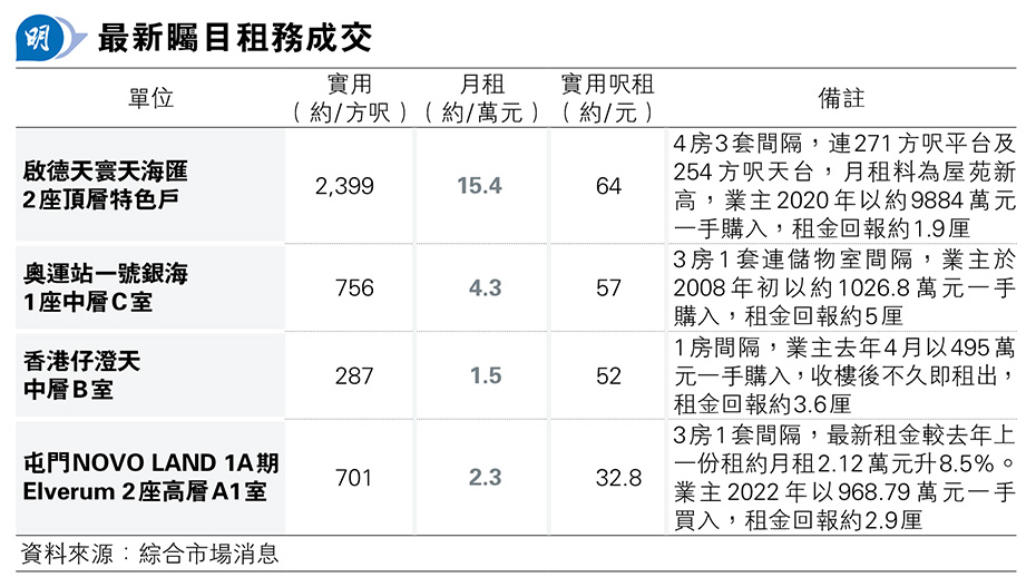 【明報專訊】本港住屋需求強勁,多個屋苑租金持續上升,其中屯門新晉屋苑NOVO LAND ,一個3房戶最新以2.3萬元「零議價」租出,較1年前舊租上升8.5%。此外,啟德天寰一個頂層特色戶,最新以月租逾15萬元租出,料創屋苑月租新高。