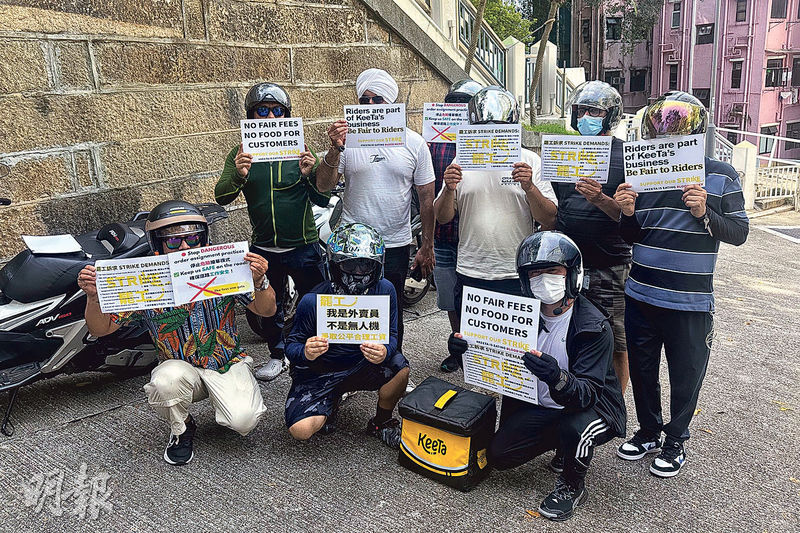 【明報專訊】外賣平台Keeta昨再有送遞員罷工,中環及紅磡共約300人響應。中環有約20名電單車外賣送遞員手持標語,要求Keeta撤銷搶單機制,並抗議近月削減單價。有參與送遞員兩月前曾因搶單釀成意外,批評搶單機制罔顧送遞員安全。