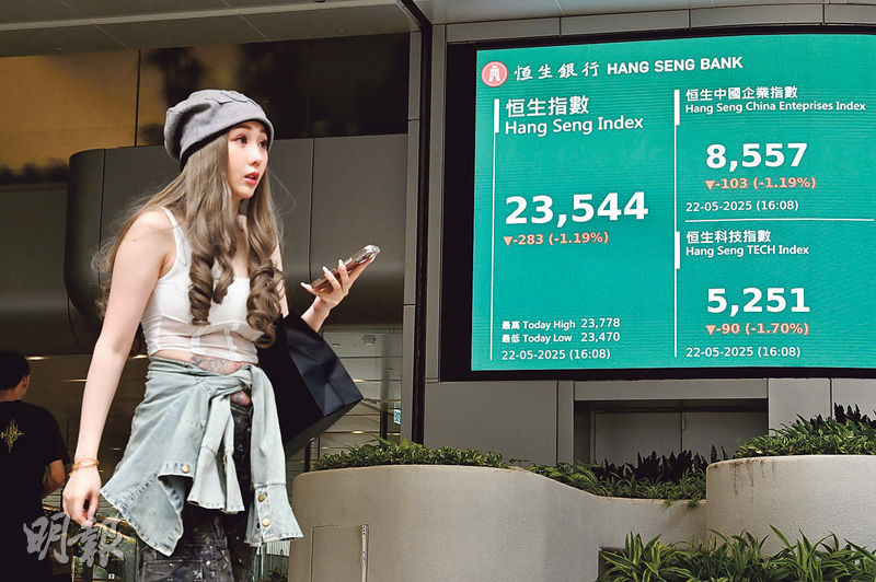 【明報專訊】美主權債遭降評級續發酵,特朗普減稅法案獲國會領袖表態支持引發財赤憂慮,隔晚美市出現股、匯、債三殺,資金避險情緒升溫。港股、A股近日升勢亦見受阻,恒指午後最多跌逾300點,最終收報23,544點,跌283點,守住10天線,成交再跌穿2000億元,證券界認為,由上月的低位計恒指已反彈約4600點,短期內或需整固。