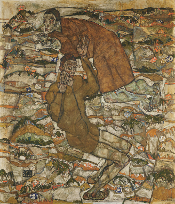 生命的最後4年,席勒畫了些什麼?Jane Kallir提到一幅自畫像Transfiguration(The Blind II)。Transfiguration,變形,畫中兩人肢體扭曲、表情破碎,一人站在地面,似乎更為穩定,另一人則飄浮在空中。兩人——其實都是席勒——背景凌亂而瑣碎,若用表現主義去解讀,大概可以反映出畫家內心的混亂。Jane Kallir解釋,這幅自畫像創作於席勒決定與Edith結婚的時期,「可以解讀為進入成年的隱喻:席勒自此告別青少年的自我,試圖擴大對世界的理解」。Jane Kallir還看到席勒的「自我對峙」:與舊情人的分離、與妻子的婚姻、世界大戰給生活帶來的改變,「令他不得不適應全新的環境和角色」。