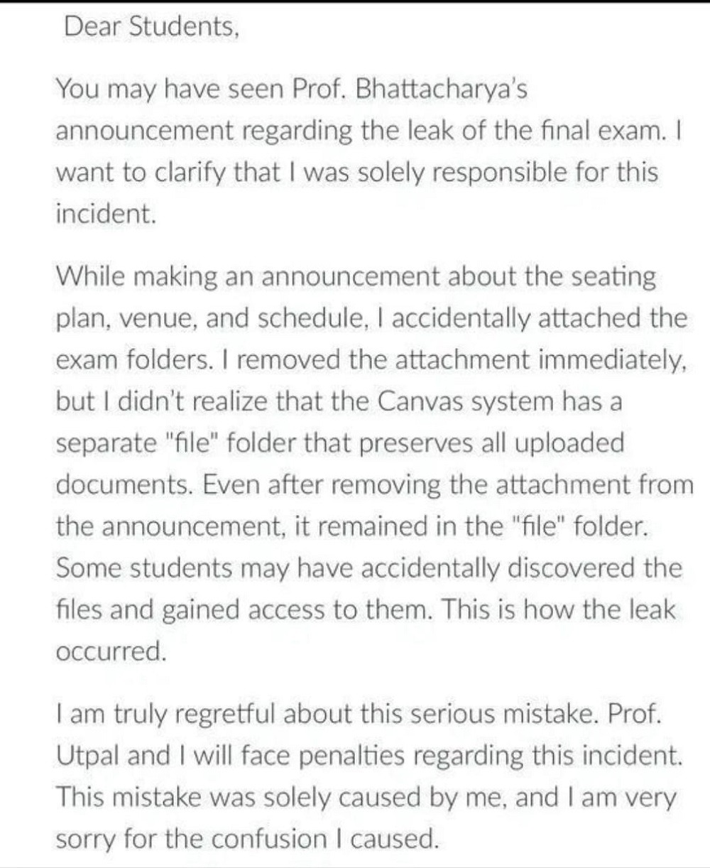 L1及L2班助教隨後亦向學生發電郵,坦承自己對事件負有全部責任。她解釋,日前在網上平台Canvas發布考試座位表及地點等資訊時,不慎將考卷檔案一併上傳。雖然她發現後已即時移除附件,但未留意平台設有獨立「檔案」欄,仍保存所有曾上載文件,導致學生有機會在「檔案」中看到考卷內容。該助教表示,自己與教授將會共同接受校方處分,並就事件向學生致歉。
