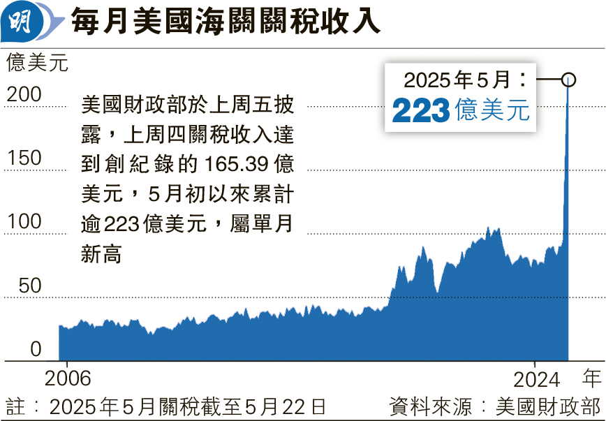 【明報專訊】美國4月起向全球貿易伙伴開徵關稅,現時「暫緩期」內稅率仍維持最少10%。美國財政部於上周五披露,上周四(本月22日)海關關稅收入達到創紀錄的165.39億美元,5月初以來累計223.04億美元,亦將創下單月新高。