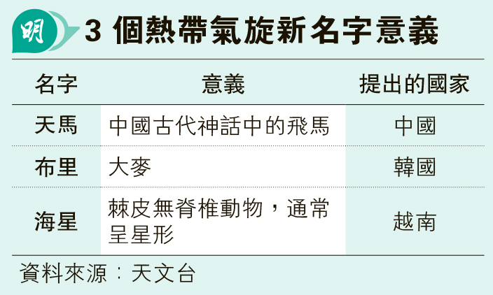 【明報專訊】打風季節即將到,天文台噚日公布,西北太平洋同南海嘅熱帶氣旋名單今年新加3個名,包括「布里」、「海星」同「天馬」,分別取代原本嘅「杜蘇芮」、「蘇拉」同「海葵」。新名已經喺颱風委員會第57屆會議中通過採用。