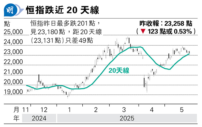 【明報專訊】內地股市五連跌,港股走勢持續反覆,於恒指結算前夕高開低收,一度跌穿23,000點,收跌123點,報23,258點,險守20天線(見圖),成交跌至1808億元為逾兩周最少,北水淨入金額亦大縮七成。「ATMJ」齊跌,汽車股跌未停,比亞迪(1211)連跌3日,累挫近60元或13%。