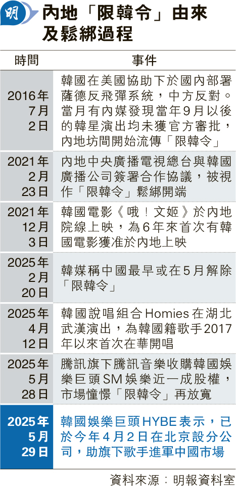 其後幾年間,中韓關係略有轉暖,「限韓令」曾獲一定程度放寬。今年2月韓媒引述消息指出,中國最早或在5月解除「限韓令」,隨着韓國總統大選下周二(6月3日)登場,早前的封關民調顯示,立場友善北京的李在明當選機會大。政情轉變下,韓娛入華再迎轉機,周三(28日)騰訊音樂(1698)收購韓國娛樂巨頭SM娛樂近一成股權,更令市場憧憬「限韓令」再放寬。