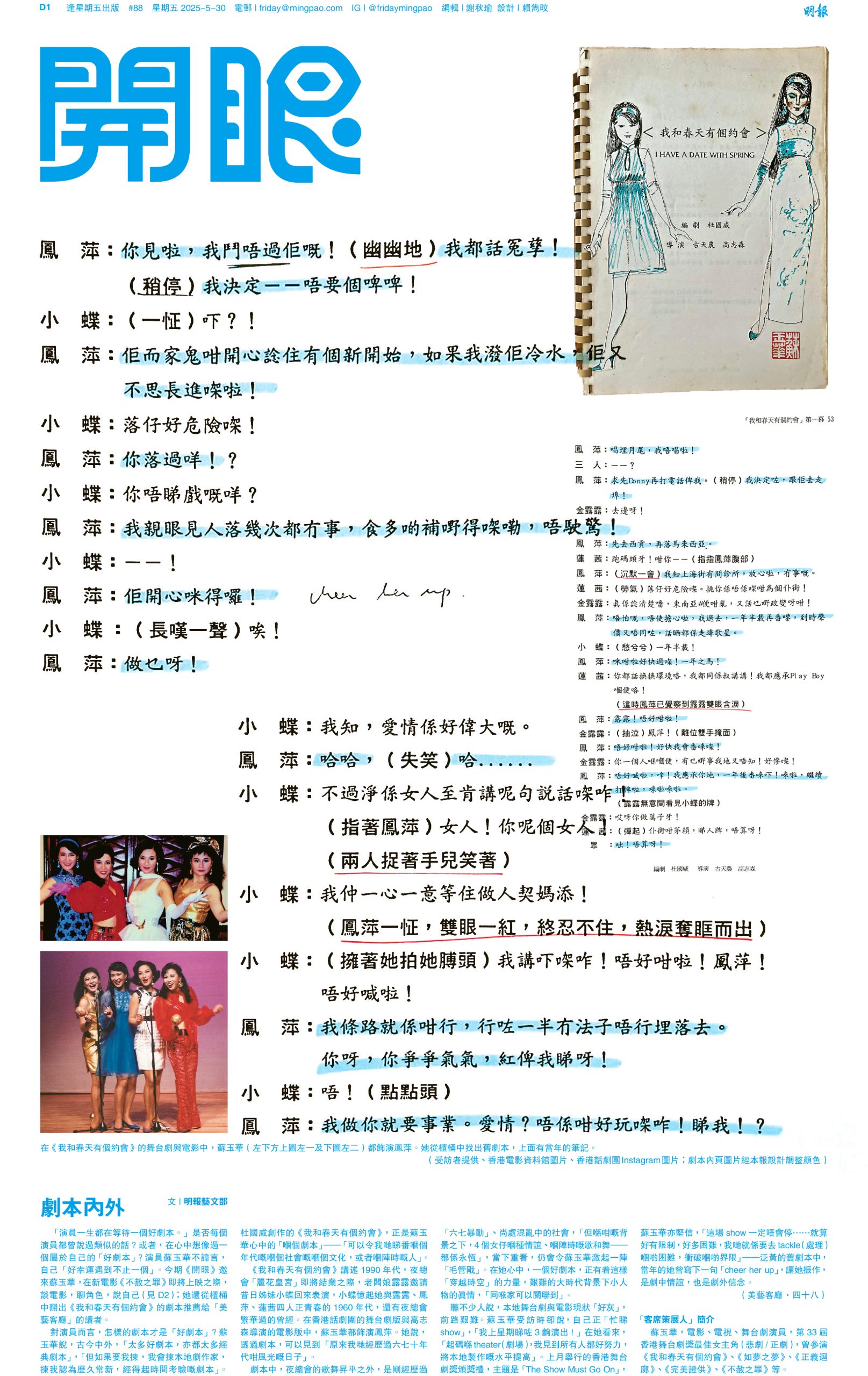 【明報專訊】「演員一生都在等待一個好劇本。」是否每個演員都曾說過類似的話?或者,在心中想像過一個屬於自己的「好劇本」?演員蘇玉華不諱言,自己「好幸運遇到不止一個」。今期《開眼》邀來蘇玉華,在新電影《不赦之罪》即將上映之際,談電影,聊角色,說自己;她還從櫃桶中翻出《我和春天有個約會》的劇本推薦給「美藝客廳」的讀者。
