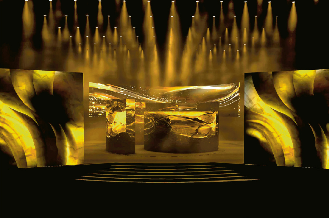 行過紅地氈,去到主舞台。Fion和Joe都強調,頒獎禮舞台,「靚緊要,但最緊要係功能性」。由許恩怡跳舞、王菀之唱歌揭開序幕,眾多「最佳原創電影歌曲」提名作品一一登上舞台,兩人觀察到與往年相比,「今年頒獎禮多舞台表演」;眾多表演,都需要配樂,因而需要「fulfill(滿足)到一個位,可以收藏到一隊band喺台上——如果就咁由後台推出來,唔好睇」。因此,兩人一開始便決定在舞台上設計一個「大轉台」——有演出時,轉台上的樂隊成員面向觀眾;沒有演出時,則將樂隊轉去背面,以大屏幕面對觀眾。只有轉台,不夠靚,「還希望可以多啲layer(層次)」,既方便嘉賓上下台,又可增加舞台美感——於是,一個「好似洋葱圈」的舞台誕生了。