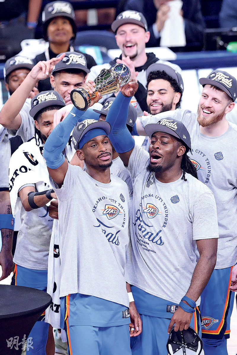 【明報專訊】頭號種子奧克拉荷馬雷霆昨於NBA西岸決賽早早拉開比數下,在主場以124:94大勝明尼蘇達木狼,以場數4:1淘汰對手取得西岸冠軍之餘,亦相隔13年再闖總決賽。而是役攻入全場最高34分的雷霆當家球星「SGA」基傑奧斯阿歷山大則繼早前奪得常規賽最有價值球員(MVP)後,再膺西決MVP。