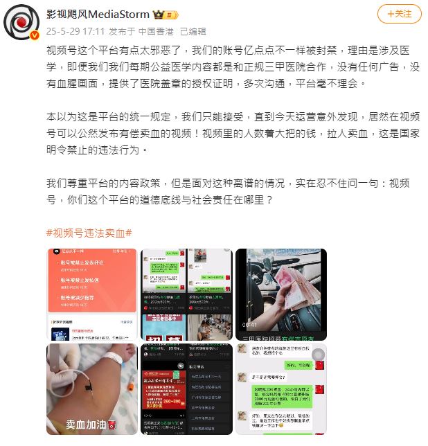內地人氣博主「影視颶風MediaStorm」5月29日在微博發帖稱,騰訊旗下的短片平台「微信視頻號」流傳大量招募賣血的內容,但自己製作的科普內容卻被平台以涉及醫學為由封禁。