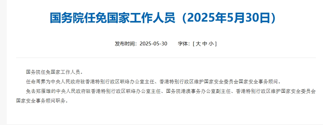 免去鄭雁雄的中央人民政府駐香港特別行政區聯絡辦公室主任、國務院港澳事務辦公室副主任、香港特別行政區維護國家安全委員會國家安全事務顧問職務。