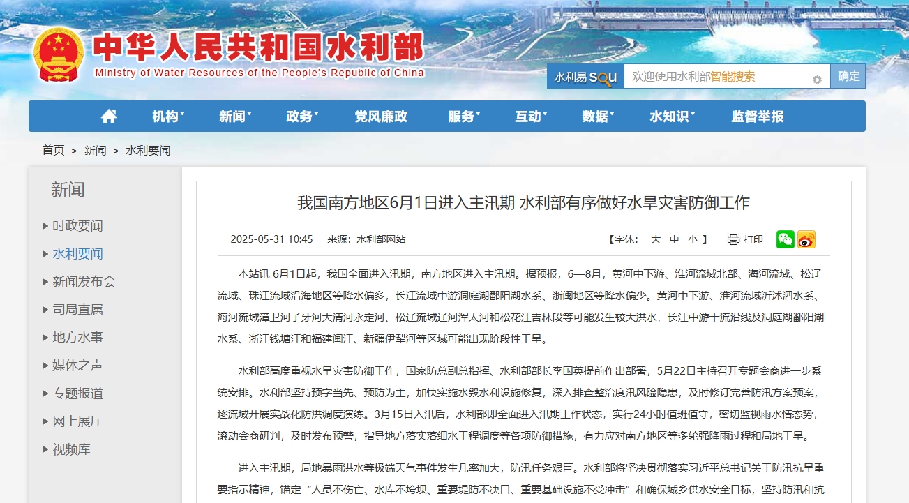 即時兩岸 南方地區6月1日進入主汛期 珠江流域今夏降水偏多 (23:37) 發佈於 4 個月 前 2025 年 5 月 31 日 By 明報 中國水利部5月31日通報,6月1日起,中國全面進入汛期,南方地區進入主汛期,水利部提前部署水旱災害防禦。 據預報,6月至8月,黃河中下游、淮河流域北部、海河流域、松遼流域、珠江流域沿海地區等降水偏多,長江流域中游洞庭湖鄱陽湖水系、浙閩地區等降水偏少。 黃河中下游、淮河流域沂沭泗水系、海河流域漳衛河子牙河大清河永定河、松遼流域遼河渾太河和松花江吉林段等可能發生較大洪水,長江中游幹流沿線及洞庭湖鄱陽湖水系、浙江錢塘江和福建閩江、新疆伊犁河等區域可能出現階段性乾旱。(中新社) 相關文章:南方汛期珠江降水多黃河洪水 Up Next 香會中方團長:反對把亞太海域當作謀求霸權的競技場 (00:54) 不要錯過 虎門高架橋4車道變3車道 官方回應5死飛墜車禍:正調查 (01:29) 繼續閱讀 贊助商 猜你喜歡