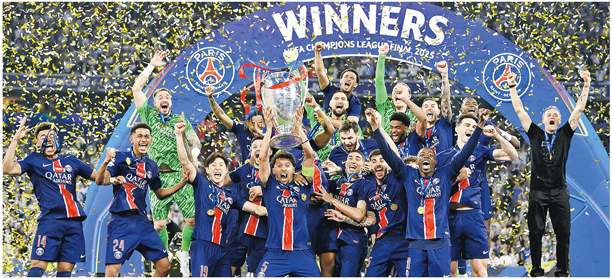【明報專訊】法甲豪門巴黎聖日耳門(PSG)昨於德國慕尼黑安聯球場舉行的歐聯決戰,結果以決賽歷來最大分差紀錄的5:0大勝意甲的國際米蘭,首登歐洲之巔,並連同法甲和法國足總盃首膺「三冠王」。法國總統馬克龍賽後稱「巴黎今(昨)晚是歐洲首都」,PSG主帥安歷基則指前鋒奧士文尼迪比利值得奪金球獎。