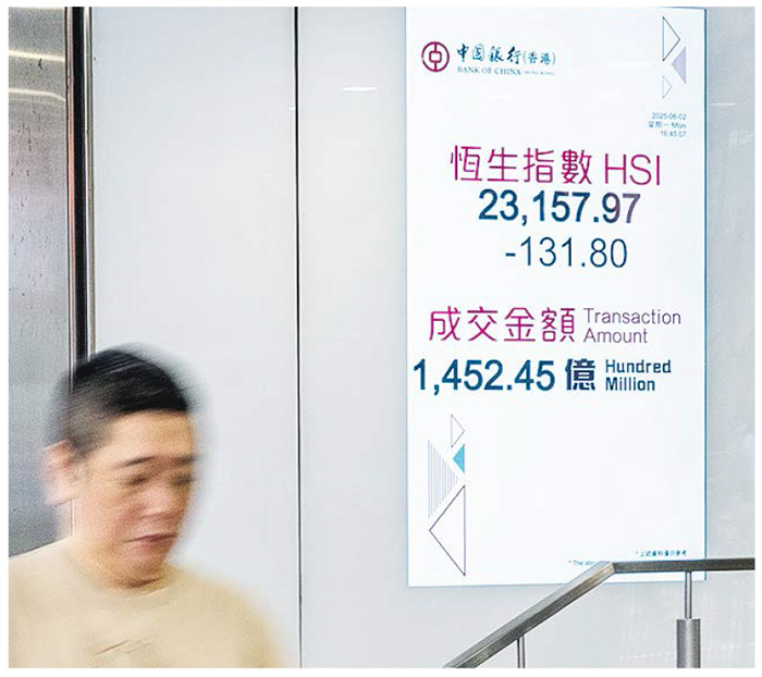 【明報專訊】美國總統特朗普指中國違反與美國達成的關稅協議,中國商務部就批評美方嚴重背離事實、堅決拒絕無理指摘。市場擔心中美貿易戰再度升溫,港股6月開局,恒指曾跌逾600點,一度失守兩萬三大關,但午後跌幅收窄,收市跌131點。內地A股休市,北水暫停,港股成交縮減至不足1500億元,見1個月低。
