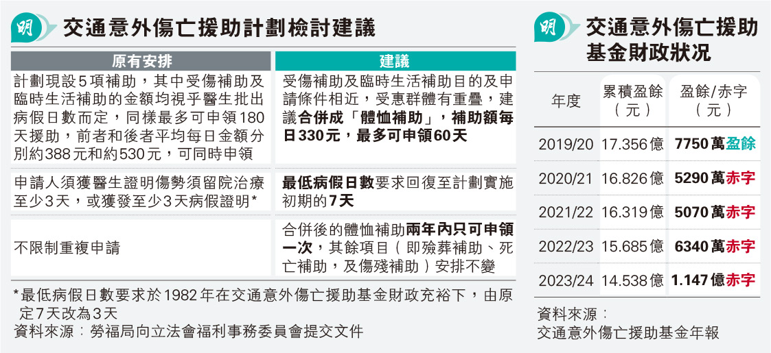 【明報專訊】去年多人涉嫌以虛假醫療證明文件騙取交通意外傷亡援助被捕,觸發政府檢討計劃。勞福局昨日提出建議,包括將「受傷補助」與「臨時生活補助」合併成「體恤補助」,最高申領日數由目前180天減至60天,並限制兩年只可申領一次。有議員不同意政府削減援助,質疑措施無助打擊濫用,又稱若要解決援助基金的財政問題,應從根源減少交通意外,令申請減少。