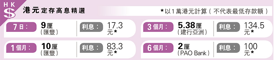 經濟 港元定存3個月年利率高於6個月 發佈於 4 個月 前 2025 年 6 月 4 日 By 明報 【明報專訊】港元定存3個月年利率存較6個月更高,若想追求高息,可留意較短的1個月或3個月。 (請看附圖) 相關文章: Up Next 被指偽造材料助內地客開戶 不要錯過 新港城3房1150萬沽 年半首錄破千萬成交 繼續閱讀 贊助商 猜你喜歡