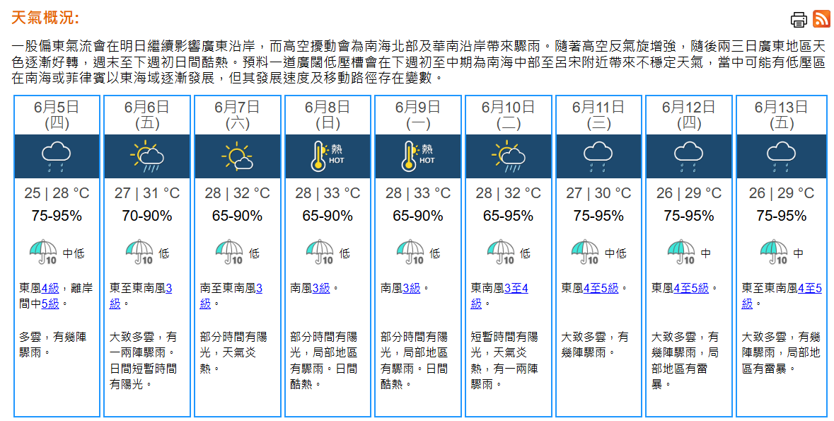 即時熱點 天氣|天文台:周四有驟雨 氣溫介乎25至28°C (20:57) 發佈於 6 個月 前 2025 年 6 月 4 日 By 明報 天文台表示,周四(5日)有幾陣驟雨,氣溫介乎25至28°C,吹和緩偏東風,離岸風勢間中清勁。展望周五(6日)仍有一兩陣驟雨。隨後兩三日部分時間有陽光,下周初日間酷熱。 相關文章:天文台天氣天氣速遞 Up Next 郭子豪外遊疑被牀蝨咬 一文看牀蝨特性、被咬處理、防蝨貼士 (14:52) 不要錯過 天氣|天文台:有幾陣驟雨 最高氣溫29°C (08:16) 繼續閱讀 贊助商 猜你喜歡 天氣|天文台:周六晚氣溫顯著下降 下周初低見15、16°C (08:23) 天氣|天文台:日間最高23°C 晚上有一兩陣微雨 (08:15) 天氣|天文台:周三早上有微雨 氣溫介乎20至23°C (20:59) 天氣|天文台:天晴乾燥最高26°C 周末期間顯著轉涼 (08:15) 天氣|天文台:周一天晴乾燥 市區氣溫19°C-25°C 周末北風增強天氣顯著轉涼 (20:01) 天氣|天文台:黃色火災危險警告生效 晚間新界部分地區降至14°C (08:38)