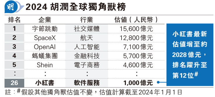 【明報專訊】彭博社引述金沙江創投(GSR Ventures)旗下的一份股份交易文件報道,內地社交平台小紅書的估值已飈升至260億美元(約2028億港元)。值得注意的是,在胡潤2024年全球獨角獸榜單中,小紅書的估值為1000億元人民幣(約139億美元),位列全球第26位。以此計算,小紅書的估值在一年半內已躍升逾87%。若其他獨角獸的估值維持不變,小紅書的排名將躍升至全球第12位。