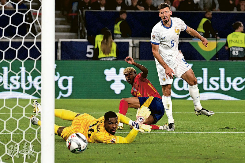 【明報專訊】歐洲國家聯賽4強昨演「入球騷」,西班牙隊一度領先4球下,終以5:4險勝法國隊,下周一凌晨將決戰葡萄牙隊。「狂牛」新球王拉明耶馬是役梅開二度,鋒芒蓋過法國隊前鋒奧士文尼迪比利,主帥迪拉富安迪也力撐愛將應奪今年金球獎。