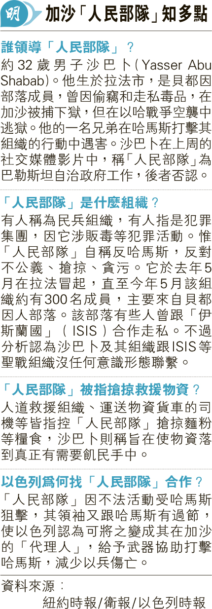 以巴傳媒分別援引安全消息報道,以方提供武器予盤踞於加沙南部拉法省、由沙巴卜(Yasser Abu Shabab)領導的黑幫「人民部隊」(PF)及給予保護。「人民部隊」所得部分AK步槍,是以軍從哈馬斯手中繳獲轉交。KAN報道,此舉是內塔尼亞胡與國家安全總局局長巴爾、防長卡茨、以軍參謀長扎米爾所作決定,未經內閣審批。「人民部隊」曾與埃及聖戰組織合作走私。沙巴卜也曾聲稱要保護運入加沙的人道物資車隊,但被援助組織等指控其幫派搶掠物資。