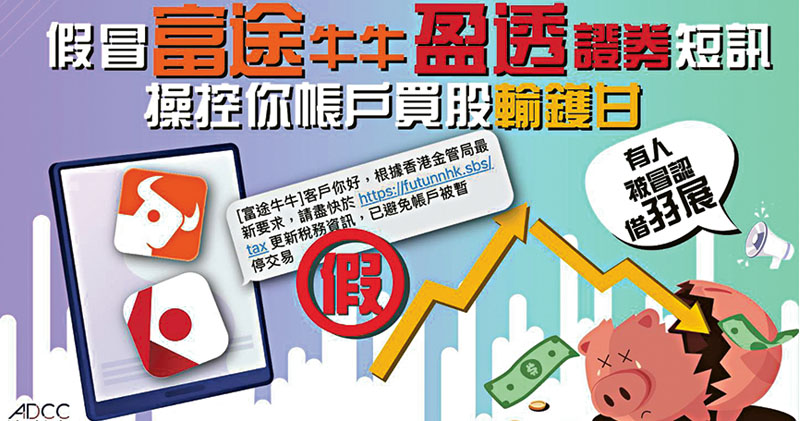 警方商業罪案調查科轄下的反詐騙協調中心亦於上周發文表示,警方過去3星期收到34宗報案,總損失金額逾1600萬港元,單一損失金額由 2000元至290萬元不等。有受害人更被冒認借孖展170萬元。受害人年齡約20多歲至60多歲,不乏教師、會計師等專業人士。騙徒手法是假扮富途牛牛或盈透證券發出附帶連結的釣魚短訊,聲稱金管局要求客戶更新稅務資料。本報記者近日仍接獲由不法分子冒充互聯網券商發出含虛假網站超連結的多則短訊,要求更新稅務或其他個人資料。