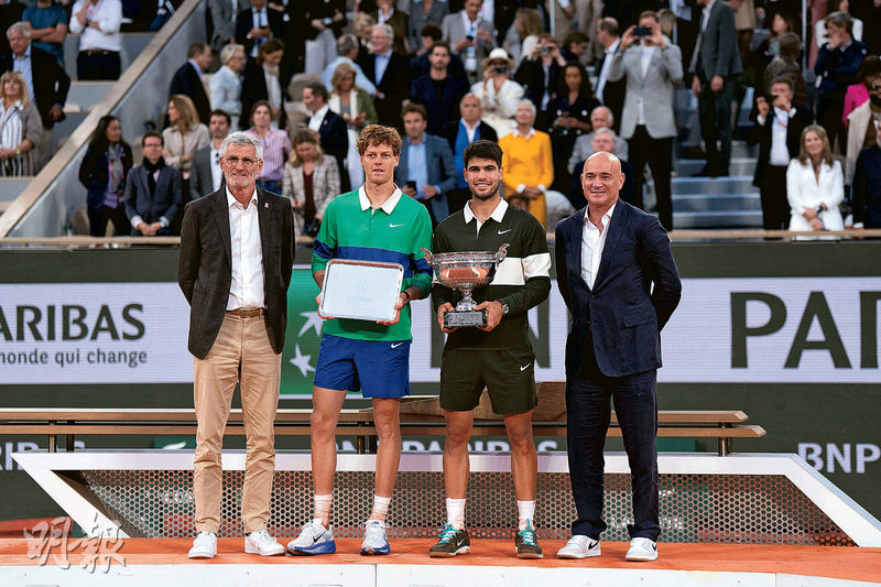 【明報專訊】法國網球公開賽昨上演一場史詩式的男單巔峰決戰,先失兩盤的次號種子西班牙籍球手卡路士艾卡拉斯連贏3盤,以3:2反勝「世一」意大利籍的史拿衛冕,而耗時馬拉松式的5小時29分鐘更刷新賽事決賽紀錄。大滿貫決賽五連勝的艾卡拉斯賽後不忘鼓勵史拿將不止一次能揚威法網,而坦言傷心的史拿則稱「這夜難眠」。