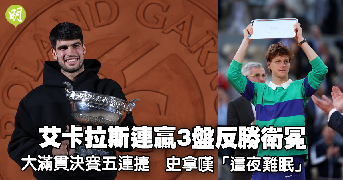 法國網球公開賽今晨(9日)上演一場史詩式的男單巔峰決戰,先失兩盤的次號種子西班牙籍的卡路士艾卡拉斯連贏3盤,以3:2反勝「世一」意大利籍的史拿衛冕,而耗時馬拉松式的5小時29分鐘更刷新賽事決賽紀錄。大滿貫決賽五連勝的艾卡拉斯賽後不忘鼓勵史拿將不止一次能揚威法網,而坦言傷心的後者則稱「這夜難眠」。