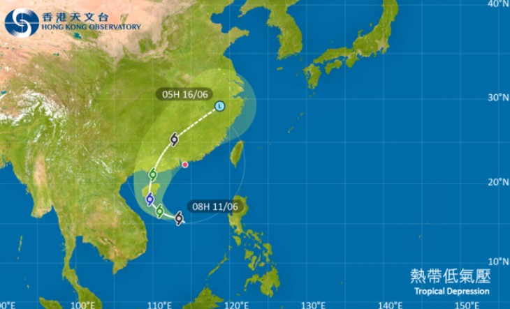 一號戒備信號現正生效。天文台表示,在上午8時,位於南海中部的熱帶低氣壓集結在香港以南約740公里,即在北緯15.7度,東經113.4度附近,預料向西北偏西移動,時速約12公里,橫過南海中部,大致移向海南島。按照現時預測路徑,該熱帶低氣壓今日(11日)仍與本港保持超過700公里距離,預料本港今日尚未普遍吹強風,但與其相關的外圍雨帶正影響南海北部及廣東沿岸。一號戒備信號會在今日大部分時間維持。