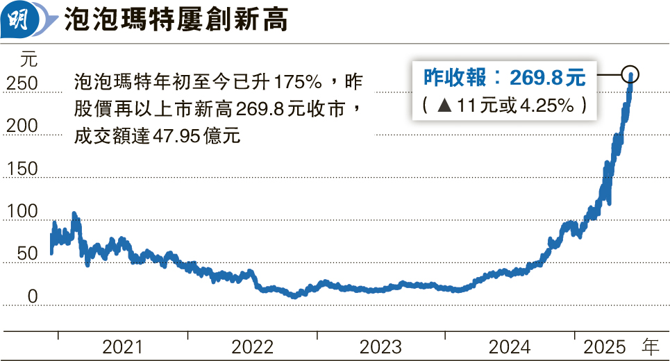 【明報專訊】泡泡瑪特(9992)旗下的Labubu公仔全球爆紅,除令公司創始人王寧成河南新首富外,投行亦看高公司一線。大行摩根士丹利報告稱,相信泡泡瑪特的IP多樣性及營運技巧結合下,能成為公司持久增長的關鍵,即使2025年增長動能或已反映,但長期規模化增長潛力尚未充分體現,故將泡泡瑪特目標價由224元,上調34.8%至302元,維持「增持」。泡泡瑪特昨股價再創新高,升4.25%,並以上市新高269.8元收市(見圖),成交額達47.95億元。