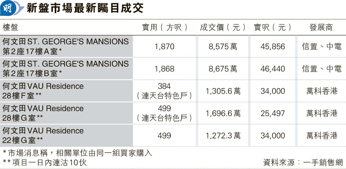 另一位處何文田自由道,同屬現樓、萬科香港發展的VAU Residence,亦連沽10伙,吸金約8395萬元,當中28樓F、G室透過招標售出;單位實用面積384方呎兩房間隔連326方呎天台,以及499方呎3房間隔連431方呎天台,成交價分別1305.6萬及1696.6萬元,實呎同為3.4萬元,買家成交期同為120日,有機會由同一組買家購入。VAU Residence售出的其他標準單位,包括27樓實用面積499方呎G室3房戶,成交價1272.3萬元、實呎2.54萬元。