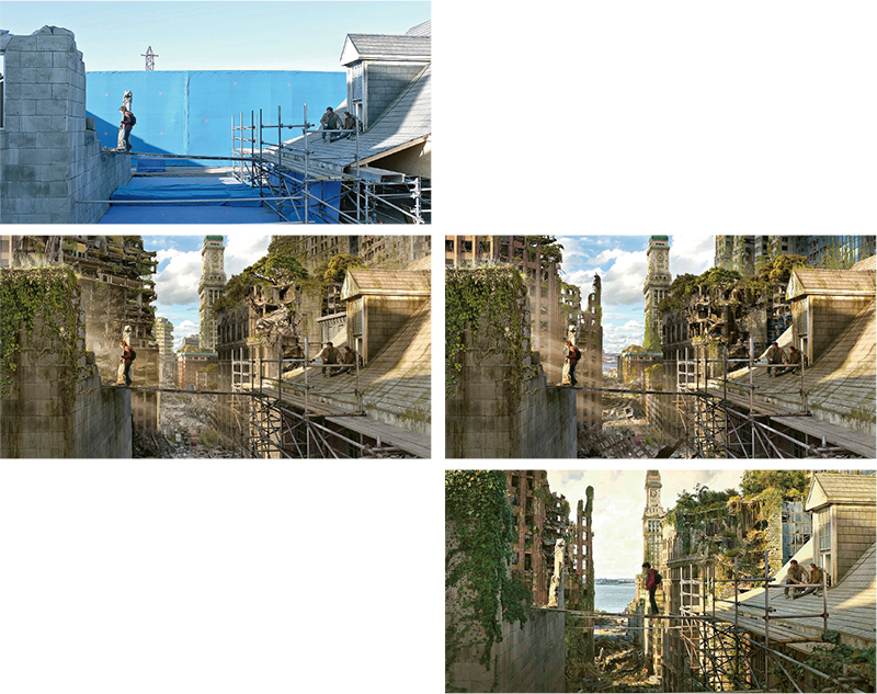 說來複雜,Peter從自己曾參與的項目、美國HBO劇集《最後生還者》(The Last of Us)開始講起。劇集改編自同名遊戲,講述喪屍病毒蔓延全球,世界彷彿末日降臨。末日之後,生還者們試圖穿越美國,重新尋找生機。劇中一幕,幾名主角身處廢墟般的波士頓,試圖從一棟大樓頂端爬向另一棟大樓頂端。Peter得到的,是演員站在藍幕前的照片。儘管有遊戲場景做參考,他仍然需要「從零開始想像」——廢墟什麼樣?破敗的大樓什麼樣?遠處的城市又是什麼樣?他用畫筆、Photoshop與3D軟件創造出兩個場景:Plan A,末日後的城市狹窄而擁擠,地上滿是斷壁殘垣;Plan B,「有種比較開放的感覺」,斷壁殘垣沒有那麼密集,透過建築的縫隙,還可以望見遠處的波士頓海灣。「他們最後選擇了Plan B,再邀請其他藝術家做3D、建模、合成、打光」,最後得到「final look」——藍幕變成末日後的城市,演員在兩棟建築間「走鋼索」,背景還可見到波光粼粼的海灣。