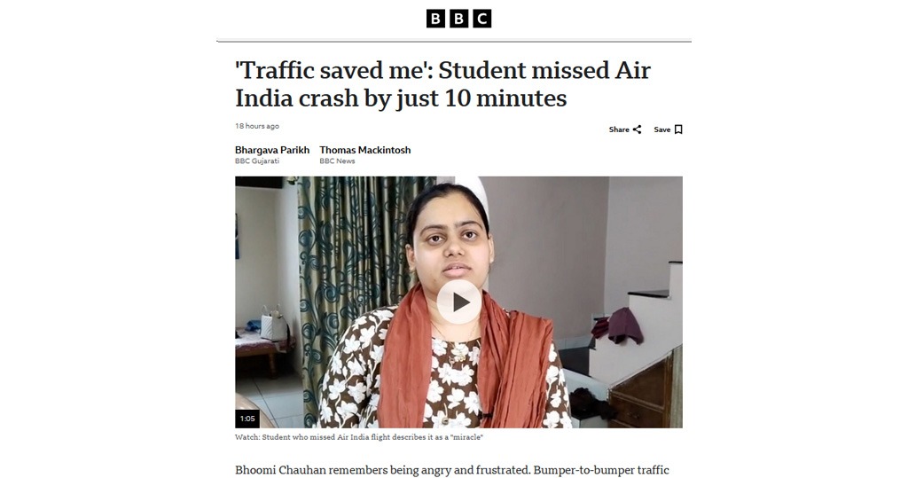 印度一名28歲女子本來乘搭日前墜毁的印度航空客機返回英國,因遲到10分鐘而未能趕上「死亡班機」,避過一劫。