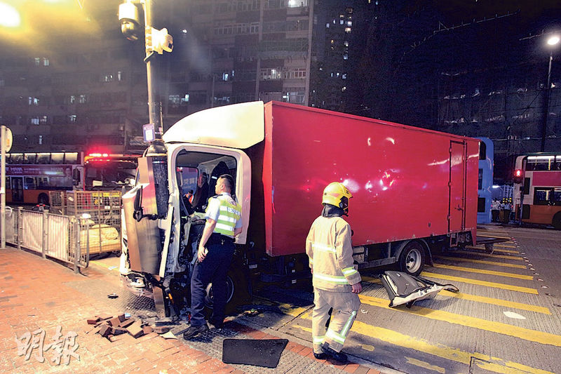 【明報專訊】北角發生驚險車禍。一輛貨車昨晚在北角長康街上落貨時,貨車在斜路突然溜前,猛撼英皇道行人過路處燈柱(圖),貨車司機及男跟車輕傷送院。長康街2018年曾發生校巴溜前5死意外。