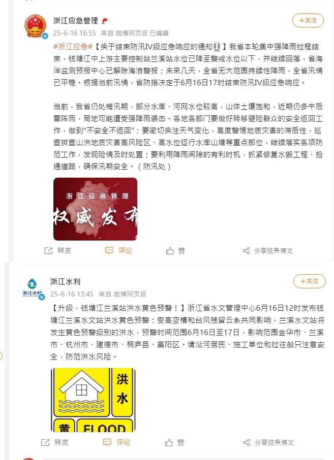 浙江水利廳官方微博帳號也在下午1時45分宣布,浙江省水文管理中心6月16日中午12時發布錢塘江蘭溪水文站洪水黃色預警,預警時間範圍6月16日至17日,影響範圍金華市、蘭溪市、杭州市、建德市、桐廬縣、富陽區。