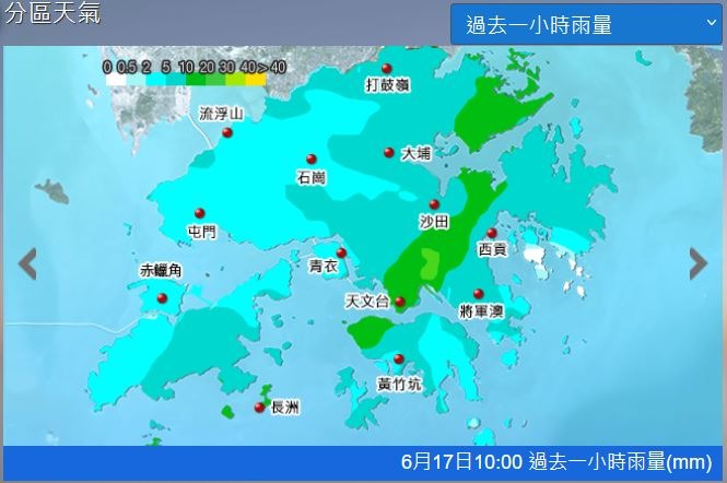 與活躍西南氣流相關的強雷雨區正影響珠江口一帶。本港方面,今早(17日)新界錄得超過20毫米雨量。此外,深圳錄得超過50毫米雨量,而中山及珠海的雨量更超過150毫米。(天文台)