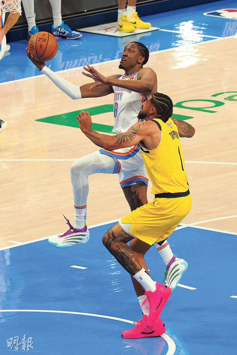 【明報專訊】奧克拉荷馬雷霆昨於NBA總決賽第5戰主場憑兩大主將謝倫威廉士及「SGA」基傑奧斯阿歷山大合轟71分,在主場以120:109力克印第安那溜馬,場數領先3:2「叫糊」。是役溜馬當家球星哈利布頓因在次節右小腿受傷一度退下火線,全場6投0中僅靠罰球取下4分,他賽後雖未知傷勢,但強調「只要能走都會繼續上陣」。