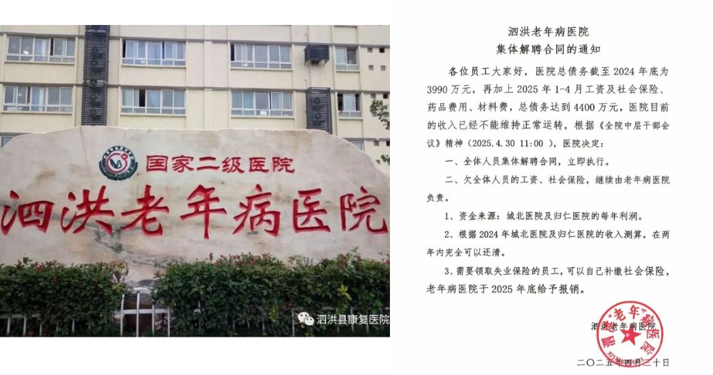 江蘇泗洪老年病醫院近日發通報稱,因總債務達到4400萬元人民幣,醫院目前的收入已經不能維持正常運轉,醫院全體人員集體解聘合同,立即執行。泗洪縣人力資源和社會保障局(人社局)工作人員表示,目前該局仲裁院已介入此事。
