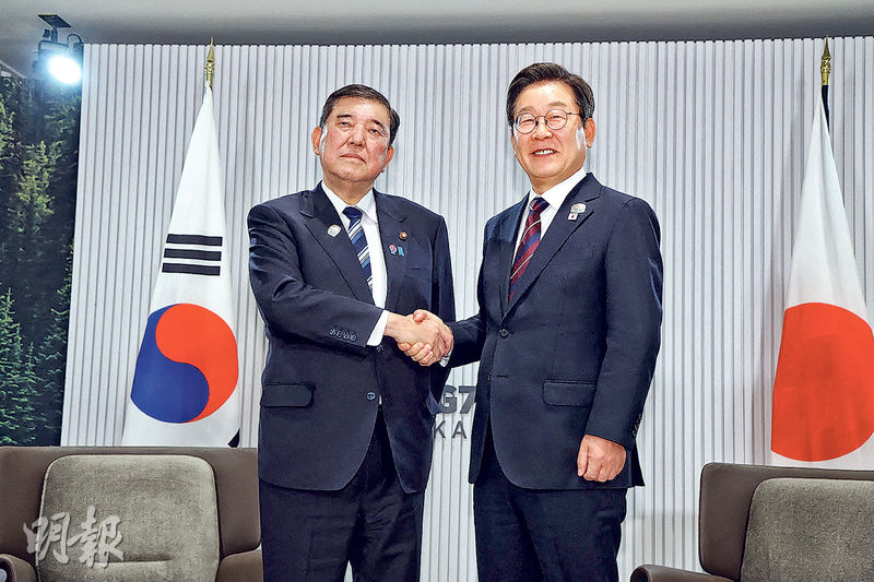 【明報專訊】韓國總統李在明(圖右)和日本首相石破茂(圖左)周二(17日)趁出席在加拿大舉行的七國集團(G7)峰會舉行場外雙邊會面,是兩人首次,雙方確認有意恢復穿梭外交。韓國總統辦公室稱,兩人會談約30分鐘,討論包括朝鮮等區域危機、如何在急遽變化的國際情勢中維持和平。李在明稱韓日就彷彿共用前院鄰居,「期待韓國跟日本可以跨越差異,在各種面向上合作,發展對彼此有益的關係」。石破茂則提到今年是日韓關係正常化60周年,並表示當前國際情勢嚴峻,「在烏克蘭、中國、亞洲都是如此」,希望兩國合作能對區域、全世界都有更多助益。韓聯社的報道指出,李在明上任僅14天就與石破茂會談,與前幾任韓國總統相比來得快。