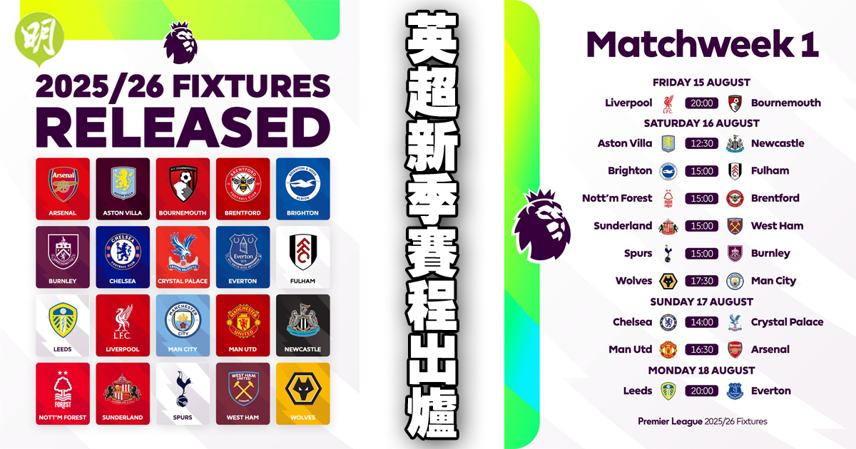 英超今(18日)公布來季賽程,開鑼戰將在香港時間8月16日周六凌晨3時上演,由衛冕之師利物浦主場迎戰般尼茅夫。首輪重頭戲要數翌日晚上11時半開賽的上季亞軍阿仙奴作客曼聯,而「兵工廠」其後第3至6輪須依次作客「紅軍」、主場遇上季前列份子諾定咸森林、曼城及出征紐卡素,相比於其他爭標對手確是「地獄賽程」。