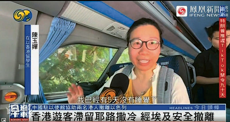 新華社報道,119名中國公民周四(19日)從以色列經埃及南西奈省塔巴口岸撤離到埃及,中國駐埃及大使館稱,此次撤離包括117名內地留學生和兩名香港人,他們將被轉送至開羅。鳳凰衛視訪問兩名一度滯留耶路撒冷的香港人。其中香港留學生陳玉嬋(圖)說:「我住的地方有個高樓大廈,今天一早就被炸掉了,所以我現在都很緊張,都還很模糊,我已經有5天沒睡覺了。」