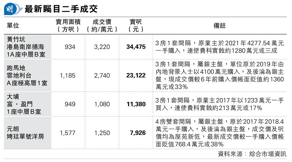 此外,部分豪宅淪為銀主盤後大幅貶值售出。資料顯示,跑馬地雲地利台A座極高層1室,實用面積1185方呎,3房1套間隔,原由銀主叫價3150萬元放售,本月初終以2740萬元售出,減價410萬元或13%,實呎23,122元。資料顯示,單位原於2019年由內地背景人士以4100萬元購入,及後淪為銀主盤,現成交價較6年前購入價帳面貶值約1360萬元或33%。